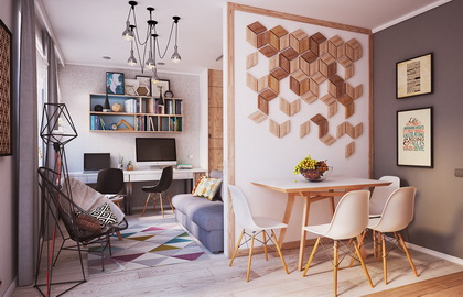 儿童房是个充满童趣的空间,亦需培养孩子对于物体形状及颜色的感知能力。此法在儿童房的墙面制作若干六方形蜂窝状橱格(也可设计其他简便、活泼的几何造型),具体做法是用普通大芯板做基材,外表抹灰,最后涂刷彩色乳胶漆。这一设计可引起孩子的想象力发挥,并且与儿童房的整体主题相呼应。